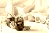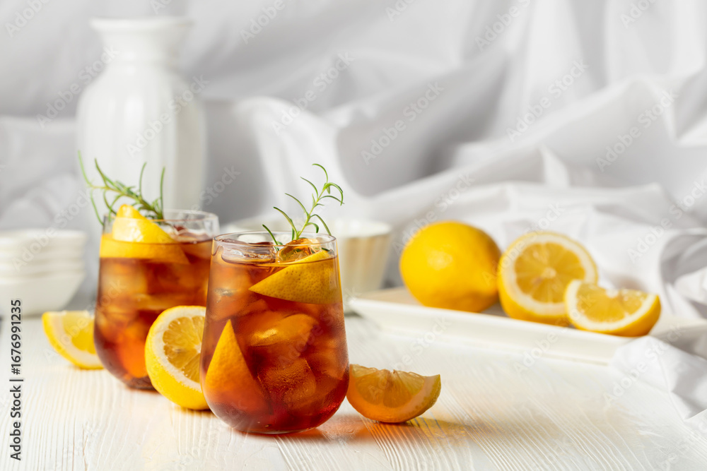 Iced tea or alcoholic cocktail with ice, rosemary and lemon slices on the white table.