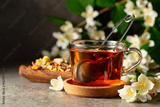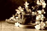 Cup of jasmine tea and fresh jasmine flowers on a stone table.