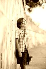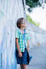 Cute boy with skateboard outdoors, standing on the street with different colorful graffiti on the walls