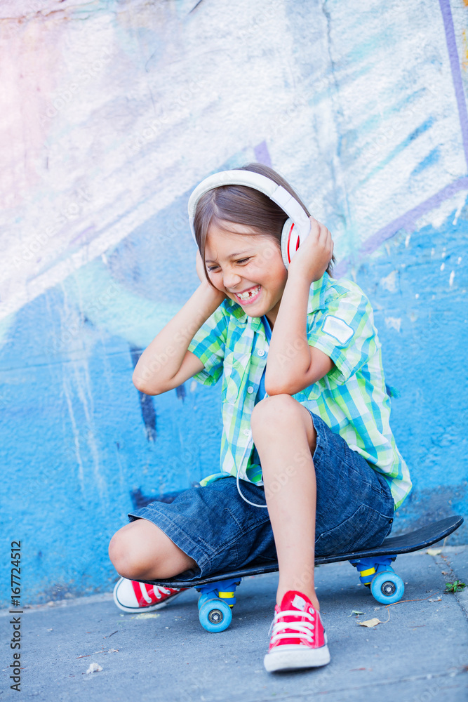 Cute boy with skateboard outdoors, standing on the street with different colorful graffiti on the walls