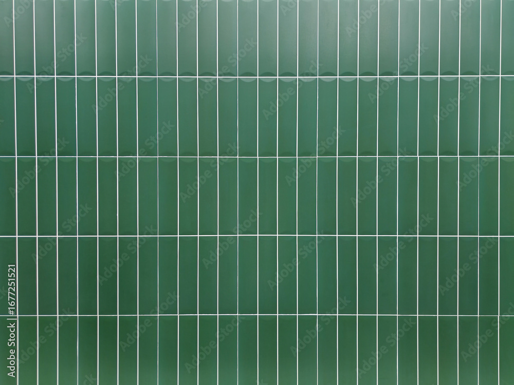 Green tile wall background with clean geometric pattern. Ceramic surface design suitable for interior, bathroom, kitchen, architecture, and decorative concepts.