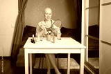 Female in pink robe doing eye makeup at dressing table, concept of beauty products, personal care and lifestyle