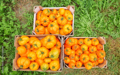 Ripe organic yellow greenhouse tomatoes in boxes, selective focus.
