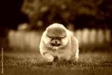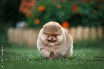cute pomeranian spitz puppy walking in the garden in summer