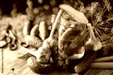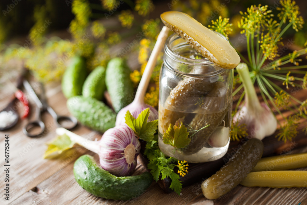 Homemade organic lightly salted cucumbers with herbs and garlic