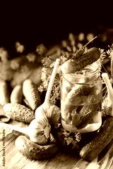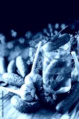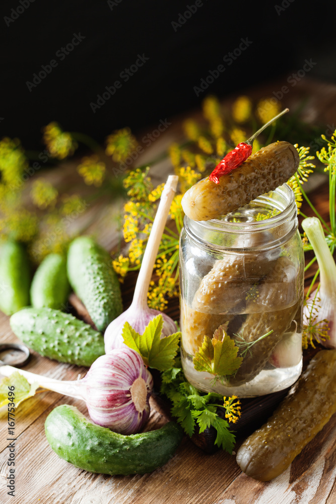 Homemade organic lightly salted cucumbers with herbs and garlic