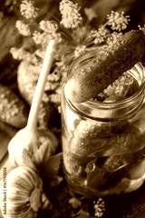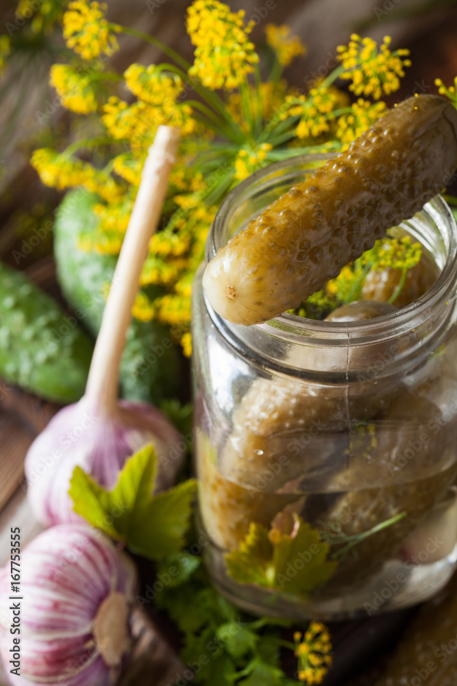 Homemade organic lightly salted cucumbers with herbs and garlic