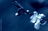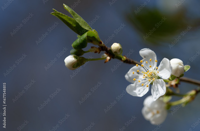 Close-up of white flowers blooming on a branch of a tree in spring. The background is blue.
