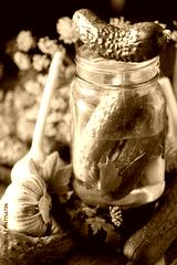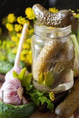 Homemade organic lightly salted cucumbers with herbs and garlic