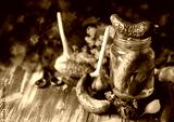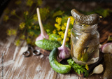 Homemade organic lightly salted cucumbers with herbs and garlic