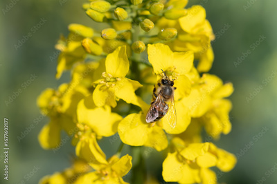 Close-up of a yellow rapeseed flower with a honeybee searching for food.