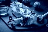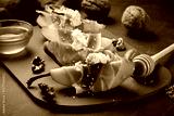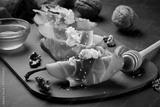 Sliced pear wrapped in prosciutto, topped with cream cheese and sesame seeds, served on an elegant black slab plate