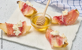 Pear slice wrapped in prosciutto with cheese and sesame seeds on a white board