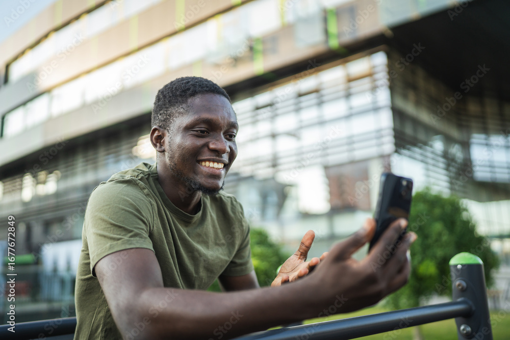 Young man making video call showing modern building in urban park