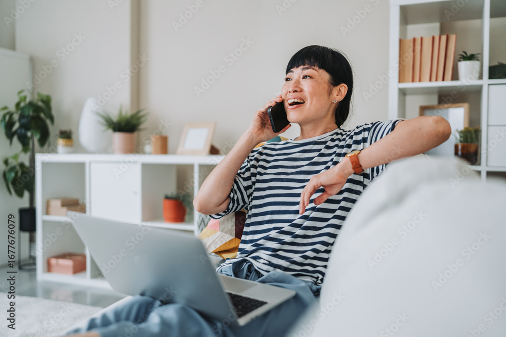 mature asian freelancer talking on phone and using laptop on sofa at home