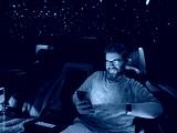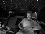 Smiling man using smartphone inside luxury van with star ceiling lights. Digital lifestyle, leisure and premium travel experience.