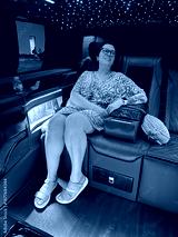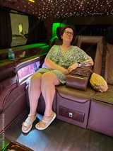 Woman sitting in luxury van with glowing ceiling lights. Relaxation, leisure and premium lifestyle in modern travel interior.