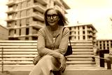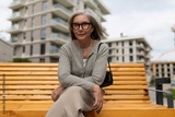 Mature woman enjoys a quiet moment on a wooden bench in an urban park surrounded by modern buildings