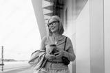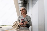 Woman at airport terminal enjoying coffee while waiting for her flight during sunny day