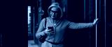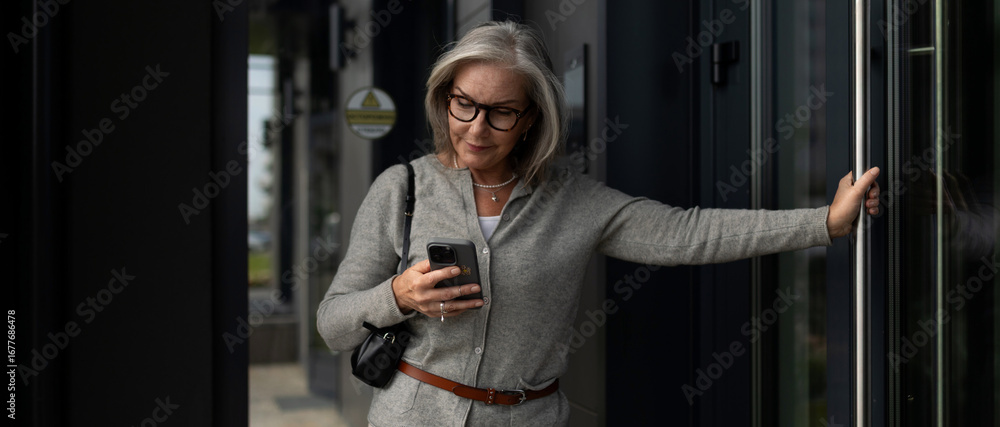 Woman checking her smartphone while leaning against a doorway in an urban setting during daylight hours