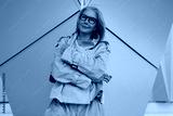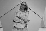 Elegant woman poses confidently in a stylish beige coat against a modern architectural backdrop during daylight hours