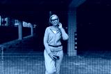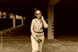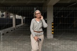 Mature woman in casual attire poses by a fence in an urban parking structure during daylight hours