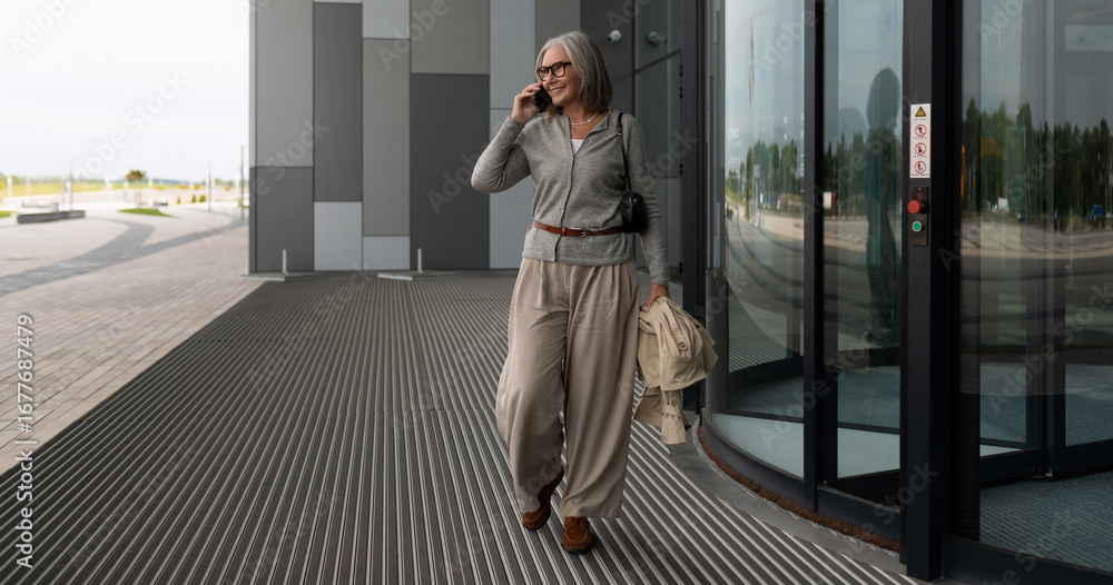 Senior woman enjoying a casual afternoon while talking on her phone outside a contemporary building