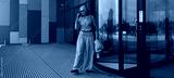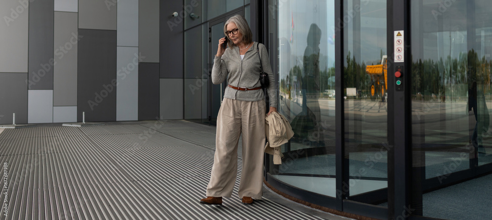Woman making a phone call outside a modern building on a sunny day in the city center