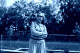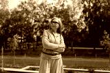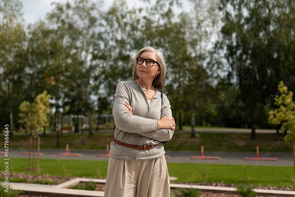 Senior woman stands confidently in a park while enjoying a sunny day outdoors surrounded by green trees and landscaped areas