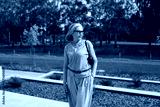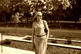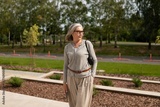 Elegant woman enjoying a sunny day outdoors while wearing stylish attire and posing near landscaped area
