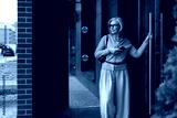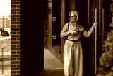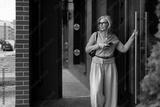 Woman stands outside a modern building checking her phone while wearing a stylish outfit in a city setting during the day