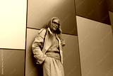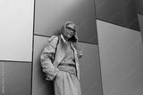 Woman with glasses in trench coat talks on phone near modern building in urban setting during daytime