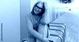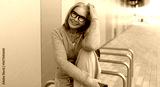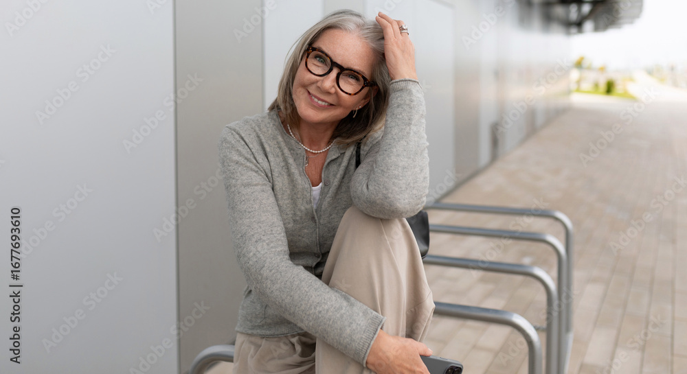Smiling woman with gray hair enjoying a moment outdoors in a modern urban setting during the afternoon