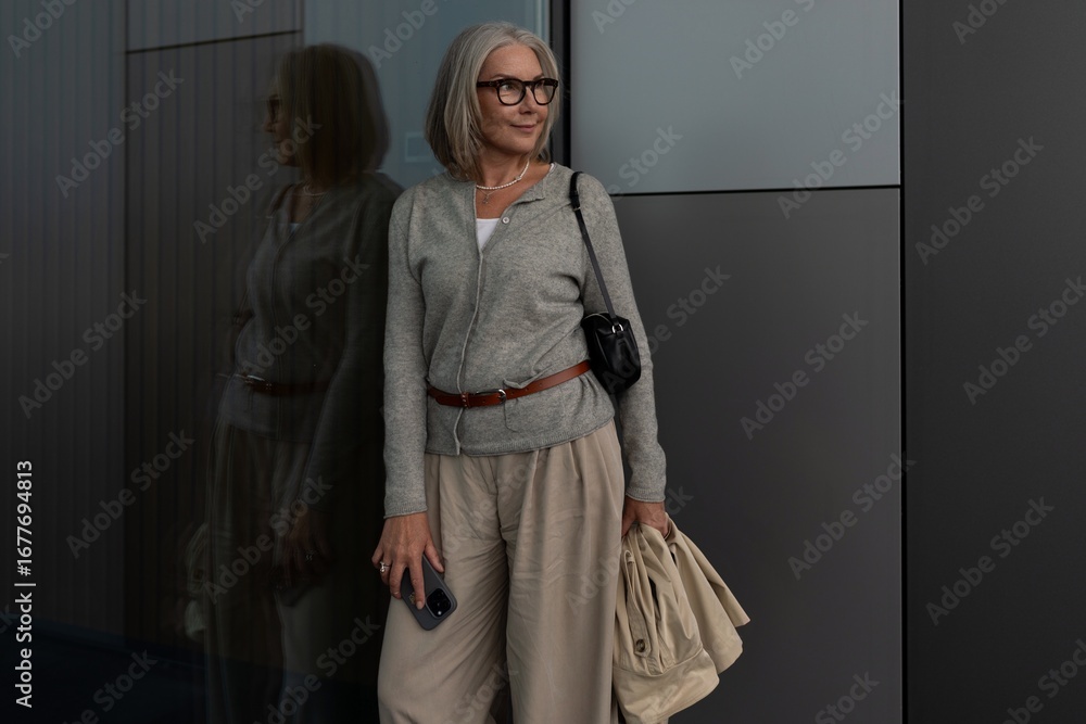 Stylish woman in gray sweater and beige pants poses against modern architecture in urban setting