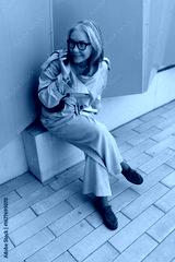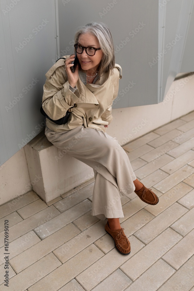 Woman in stylish trench coat seated outdoors while using a smartphone in a modern urban environment during daytime
