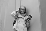 Stylish woman with gray hair enjoys coffee while leaning against a wall in a city setting during daytime