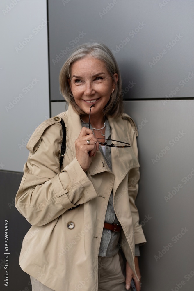 Older woman smiling confidently while holding glasses in a modern urban setting during daylight hours, showcasing a stylish look