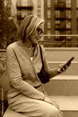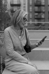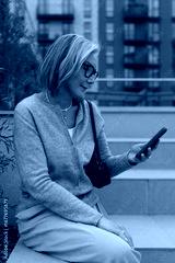 Woman using smartphone while sitting on outdoor steps at modern apartment complex in a city setting