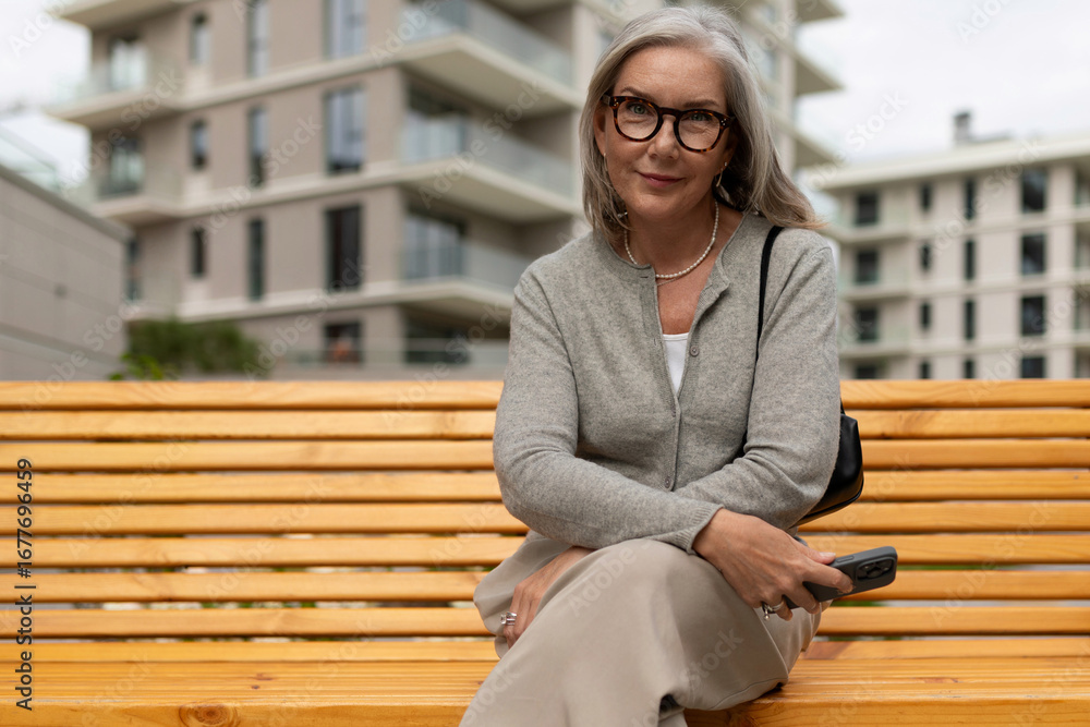Woman sitting calmly on a bench in an urban area, engaging with her smartphone while enjoying a moment of peace
