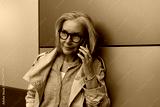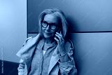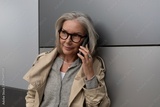 Senior woman with glasses talking on mobile phone outside modern building during daytime in urban setting