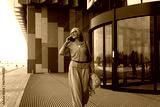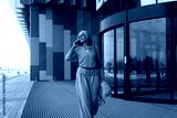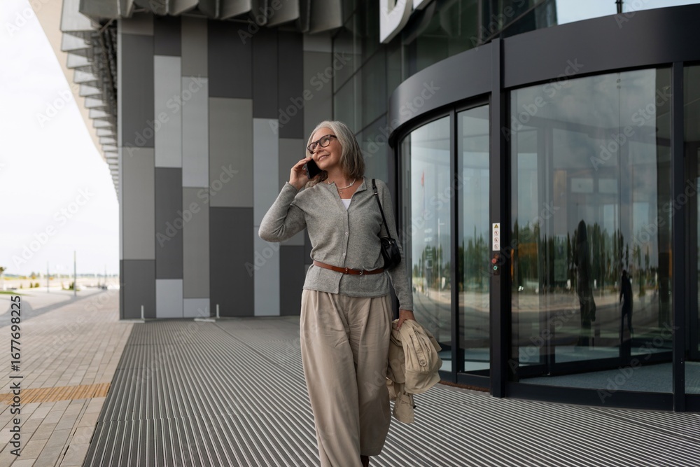 Mature woman strolling outside a modern building while talking on her phone in a city environment