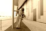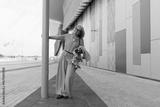 Woman in light attire leans against pole while exploring modern architecture during daylight
