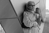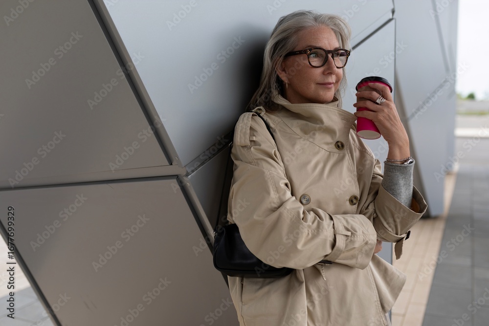 Stylish woman enjoying coffee while leaning against modern architecture in a city setting