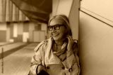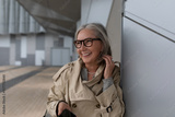 Joyful woman with glasses enjoying her day in modern urban setting during daylight hours