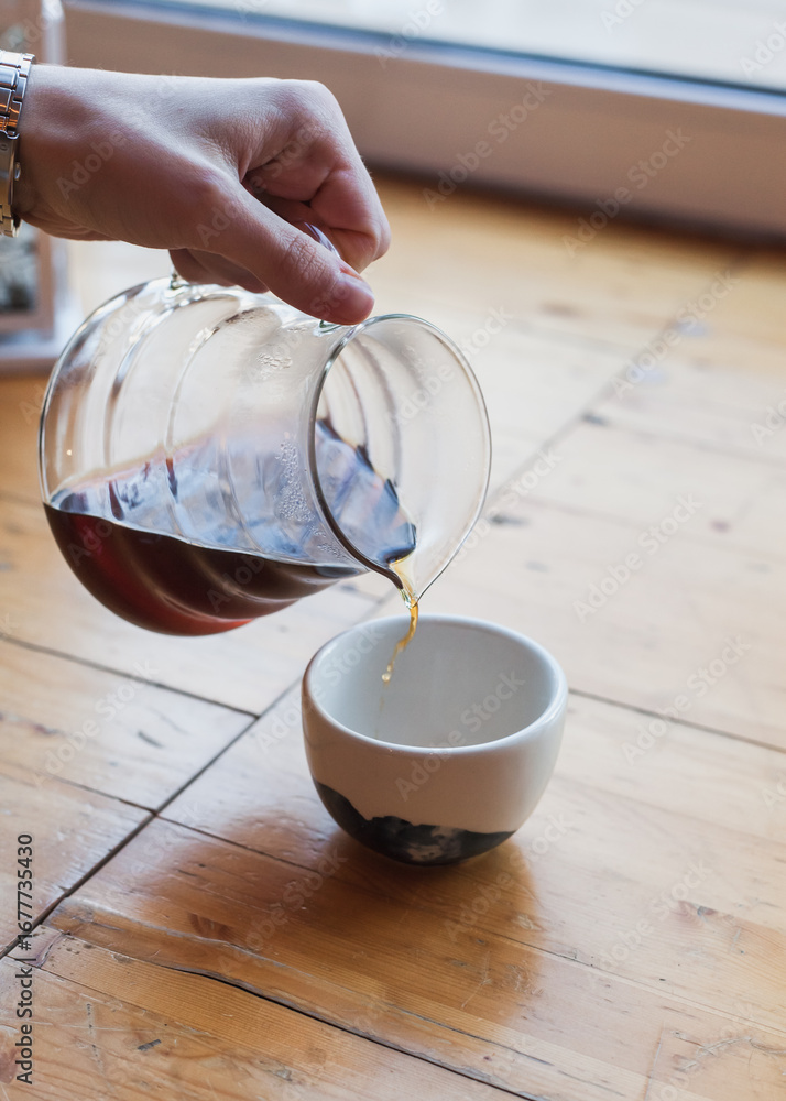 Barista pouring filter coffee from kettle to a ceramic white cup. female or man hand holding glass teapot server with black pour over coffee. alternative brewing, specialty v60. background light wood