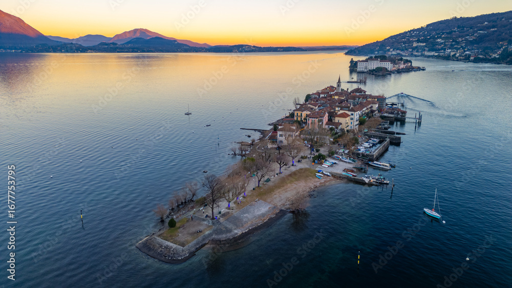 Sunset panorama of Isola Bella and Isola dei Pescatori at Lago M