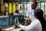 Green technology company engineering team working on innovative sustainability projects in office, integrating solar energy products with advanced electric grid solutions.