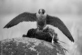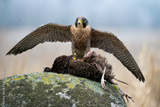 Peregrine Falcon with Prey Standing on Mossy Rock in Natural Habitat
