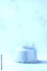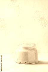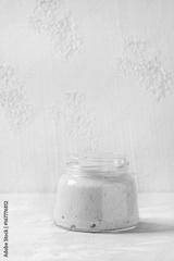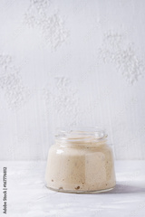 Rye starter sourdough in glass jar for baking homemade bread over gray concrete background.