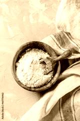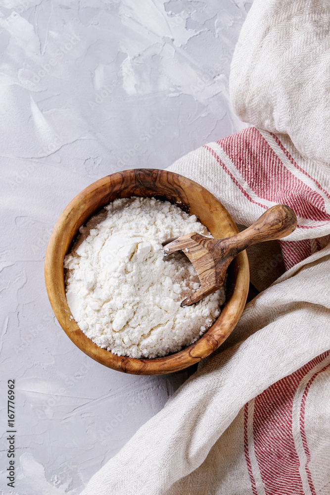 Olive wood bowl with wheat flour and scoop for home baking. With kitchen towel over gray concrete background. Top view, copy space